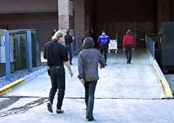 Eau Claire, Wisconsin: When I awoke in my bunk Saturday morning, I could feel the bus starting and stopping, which meant we were off the interstate and working our way through another city to another hotel. Today, the Holiday Inn in Eau Claire, Wisconsin. I went to college in this town, then lived here another seven years. I still return frequently and wanted to watch as we drove the familiar streets so I drew open the curtain. It met resistance. I tugged harder and it slid open a foot. I tugged again and as it opened further I found myself fenced in by a crisscross web of gaffers tape. The haphazard latticework ran the length of the bunk. In order to get out I had to tug and tear an opening through the sticky strips. I realized immediately that I'd been had and that this was my going-away present. But it was only the first of several surprises. Thinking I should take a picture of the pranksters' macrame, I discovered that the Discovery-issued digital camera was nowhere to be found. Neither was the Discovery-issued laptop, my briefcase, or my boots. I looked fore and aft, trying not to wake anyone. Nothing. I'll jump ahead now and say that eventually, after a few folks woke and offered a hint or two, I found my possessions squirreled away here and there. But the fun wasn't over. My boots had been completely unlaced, then re-laced backward and snugly knotted at the base of the tongue. By the time I got my footwear restrung I had an audience of grinning fools. Their grins turned gleeful when I discovered their coup de grace: Each boot had been filled with cheese slices from Friday night's deli tray. The whole thing reminds me of an Agatha Christie mystery I read in which a man is murdered on a plane in mid-air. I know that the person(s) who perpetrated this malfeasance is(are) somewhere on this bus. I believe I have the suspects narrowed down to one road manager and one sound man -- both were still awake when I turned in. Come to think of it, our driver Ty is definitely culpable as an accessory after the fact since he was awake at the wheel when the dark deeds transpired and did nothing to intervene. And he's certainly guilty of obstruction of justice, as he refuses to sing. When I saw Marty later in the day he said, "I understand you got crewed!" Yes, I surely did. Made me grin all afternoon.