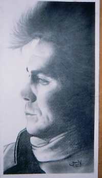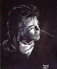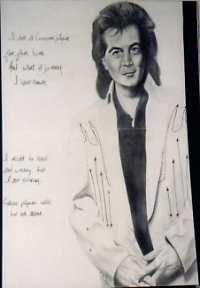 This drawing came to Bev in a dream. She woke up and knew she had to make it come to life. The words to "The Pilgrim" are in Marty's handwriting. This "life-size" drawing is actually bigger than life. Everyone who sees Beverly's work is amazed at her talent. Marty himself loves Beverly's work and her drawings hang proudly in his parents' home. |