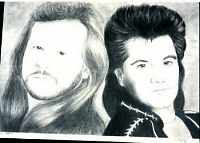 | Beverly drew these portraits of the Fabulous Superlatives, Kenny Vaughan, Brian Glenn and Harry Stinson. She gave them to the guys on August 7, 2004 and they were very impressed. | ||