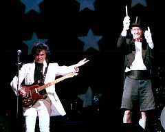 It sure was nice when they opened the doors so we could cool off. There is no better view of the stage than front row center and this year my dear friend Mary Runyan managed to snag those priceless seats. I figured with a new camera and great zoom lens, the pictures would be absolutely fabulous! Okay, so Mario still needs to learn how to use the camera, but he did get some fabulous shots. This was the first concert we'd seen since Marty revamped the show and put Mike and the rest of the crew in costumes. Mike comes out first in his ringmaster outfit trying to get the fans to scream and yell loud enough to make Marty and the Rock and Roll Cowboys want to perform. Put Mike in stage clothes and give him a microphone and he wants his own show. Just kidding! He does a great job of getting the crowd excited (okay, so he's the warm-up act) and on their feet.