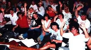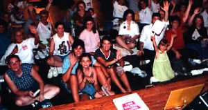 Marty walked among the fans while we were eating. He gave out hugs, kisses, handshakes and minutes of his time. Being the down-to-earth person he is, he even walked over and helped himself to some iced tea and dessert! He stopped to talk with the fans along the way--that's just how Marty is. After folks were done eating, some fans found a place on the floor in front of the stage, anticipating Marty making his appearance. I'm sure you can recognize some faces in these photos: Tami from Panama City, FL; Lisa Phillips from Tuskaloosa, AL; Penny Risk from Seattle, WA,; Barbara Smith from Maryland; Chad Decker brought little Anna back. Chad and Summer moved to Oklahoma this year and they promised Anna they'd bring her back for Marty's party. Grandma Margie is also in the picture as well as Margie Brodmerkle from Oakham, MA; Corinne Greaves from Connecticut; Cindy Allred from Dora, AL; Mary Runyan from Dayton, TN; Jill Meister from Greenville, KY; Evelyn Totty from Mayfield, KY; and I can see Pat McLaughlin just behind Evelyn's waving hand (Pat's wearing a hat). As you can see, people came from miles and miles around to enjoy the party.