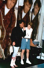 Marty's booth at the fairgrounds consisted of a backdrop of one huge center panel picture of Marty and two smaller ones (same picture) on each side. The photo was gorgeous. Marty has one of the very few booths where you are allowed inside to pose along side Marty. Display cases showcasing the merchandise form two sides of the booth. Some of the new merchandise: ballpoint pens (who can't use those), a new photo pin, a new photo T-shirt, a group photo of Marty and the Rock & Roll Cowboys. Those cool dudes even have their own T-shirt now. (Here's Marty at the booth with fan club co-president Judy Allston)
