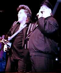 Mario snapped a photo me of and Marty -- actually two of them but Marty wasn't looking at the camera for the first one. I figured I might get a new picture for my Welcome Page, but I look a mess (I really do need to put some blonde in my hair) and I'm draped all over Marty, so it looks like it needs to go on this page for the time being!!! (Maybe at the Fan Club Party.) By the way, I had someone come up to me and ask if I was Connie. I'm still trying to figure out if she meant Connie as in Marty's wife or some other Connie. As you can see, I certainly can't be mistaken for Connie Smith -- Mrs. Marty Stuart. If, on a scale from 1 to 10, Connie's a 10, I'm about a -2. But I got a chuckle out of it. By the way, Marty's holding the paper from CountryCool.com
