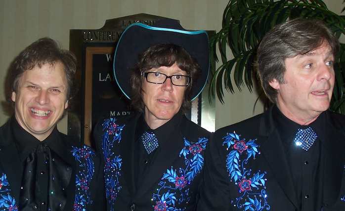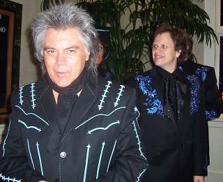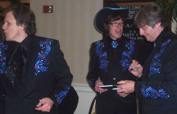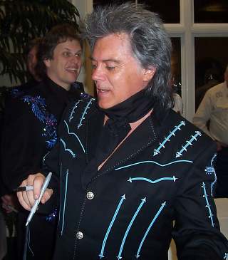 A young girl came on stage to announce them and had a little trouble pronouncing "Superlatives", so we all laughed a bit at that. They took the stage right on time (7:30 p.m.). Marty wore his usual black leather pants. He had on a black jacket with white stitching and crosses on the upper sleeve and back, and a black scarf tied around his neck. The Superlatives were dressed in black suits trimmed in blue floral appliques. Very sharp looking!