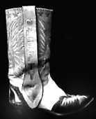 The Pilgrim, a "concept" album by Marty Stuart that you could, with equanimity, call the country music version of Sgt. Pepper, rode into the pantheon last year. It has depth, range, and passion; you couldn't shake it if you wanted to, and that is not a solo observation. Bob Dylan spoke to Stuart about The Pilgrim and said: "You've finally done a grown-up album, man." Dylan then broke into an a cappella version of one of the album's songs, "The Observations of a Crow." When Dylan came to the part, "He's a protected witness from a Detroit job/Turned his best friend in, his name is Bob," he made a slight alteration and sang "--his name is.....ME!" [Shown right is Lefty Frizzel's right boot.]