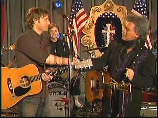 After a commercial break, Eddie Stubbs promoted the "Superlatone Collection" of five CDs, Live at the Ryman, Badlands, Compadres: An Anthology of Duets, Cool Country Favorites and Souls' Chapel. He introduced Marty again. Marty said, "Dierks, thank you for coming by." Dierks said "Thanks buddy. "Marty continued, " I love what you're doing out there. You're making some great songs and some great records. Making a lot of people happy." Dierks said, "This is fun to be here. This is a highlight for us." Marty says, "You still 'Got A Lot Of Leavin' Left To Do'. That's the one I wanna hear. How about a hand for Dierks?" Handsome Harry and Marty sang background vocals on the song.