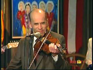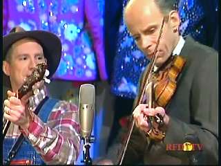 Marty said, "Yes, sir. That's beautiful. Fine job, Dale Jett, Oscar, Miss Teresa. Thank you so much." Eddie Stubbs said, "Great job right there from Dale Jett and Hello Stranger. 'No Depression In Heaven'. Boy, the sounds of early country music is alive and well here today on The Marty Stuart Show." Eddie promoted the two DVD set of highlights from the first season of The Marty Stuart Show. After a commercial break, Marty said, "Welcome back to The Marty Stuart Show. Hey, Superlatives. Dale and Oscar and Teresa loadin' up them hay bales. Fine job. Eddie Stubbs. You got a second?" Eddie comes over to Marty carrying his fiddle. Marty says, "Hello, Mr. Stubbs." Eddie says, "Hello, Mr. Stuart. You rang?" Marty says, "Yes, sir. Fillin' in for Connie Smith today, I tell ya what. We closed Season 1 with you playin' the fiddle and the cards and letters poured in. Folks wanna hear you play some more fiddle. You're not as pretty as Connie Smith." Eddie said, "Well, that's for sure." Marty said, "Yeah, but you play the fiddle better than she does." Eddie said, "She's got a lot more hair than I do, too." Marty said, "How 'bout fiddlin' us a little tune." Eddie said, " 'Wake Up Susan'. Will that be all right?" Marty said, "That's a good one. In the key of A." Eddie said, "In the key of A."
