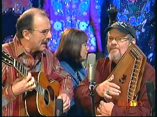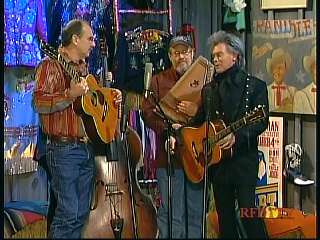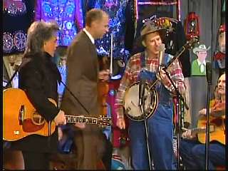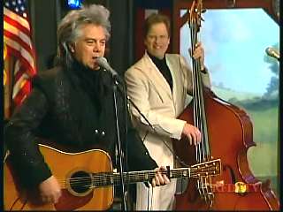 Marty said, "That's all right there. What's gonna become of that boy right there. I don't know. How 'bout a hand for Dale Jett and Hello Stranger. Thank you all for comin'." Dale said, "Thank you, Marty. Appreciate it." Marty said, "You're my favorite. Dale, I read ..... a critic once wrote about The Carter Family, the original Carter Family he said that 'In the light of perfect beauty, tears are the only answer.' And it's amazing to me how much power those Carter Family songs still have almost a hundred years since they were first recorded. And one of the ones that just keeps on comin' at you is one of my very favorites.... 'Anchored In Love Divine'. Would you honor us with it today?" Dale said, "I'd be glad to. It was one of my mother's favorites as well." Marty said, "We're gonna send it to Heaven to Janette today, all right?" Dale said, "All right." Marty joined them on the song.