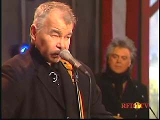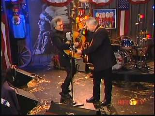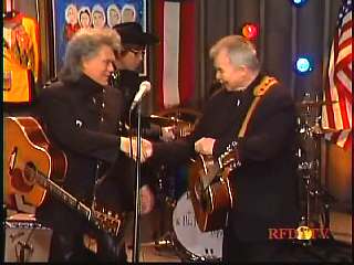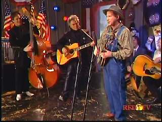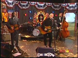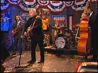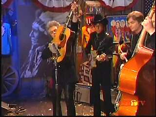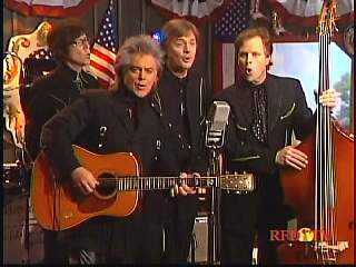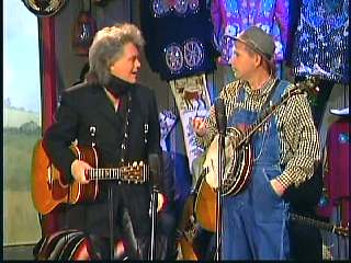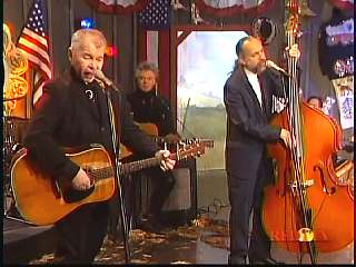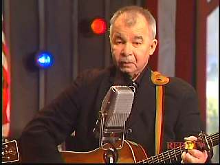 After a commercial break, Eddie Stubbs promoted the Superlatone Store. He introduced Marty. Marty said, "Thank you, Mr. Stubbs. And, Mr. Prine. Come around here, my friend. John Prine, thank you for comin' by." John said, "My pleasure." Marty continues, " Well, I tell ya what, I appreciate you bringin' Jason and Dave, too. They lookin' good this morning, Jason. Yes, sir. John, thank you for all your great songs you've given us." John said, "Thank you, Marty and thanks for having us here on the show." Marty said, "You betcha. Now there's one that is the national anthem of a lot of things. Would you do 'Paradise' for us?" John said, "I'd love to." Marty continued, "How 'bout a hand for Mr. John Prine. Thank you, John."