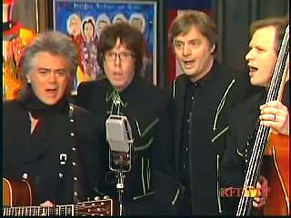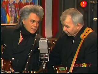 Marty said, "Put it there, Mr. Prine. I wouldn't take nothin' for that. Thank you." Eddie Stubbs said, "Great job there from John Prine and Marty Stuart together on one called 'Souvenirs'." Eddie then promoted Marty's photo book, Country Music: The Masters. After a commercial break, Marty said, "Welcome back, everybody. This next song goes out to everybody in Frog Level, Mississippi. The Sultan of Goodlettsville, the most popular man in country music, the ole Tennessee Slicker. Ladies and gentlemen, how 'bout a hand for Mr. Leroy Troy. Hey Troy boy. Hey. There he is. You know Jason, Connie, John, Dave." Marty: "What's on your mind, Goodlettsville man?" Leroy: "Well, I'll tell you know what, man. We've had three......" Marty: "Three." Leroy: 'Maple trees cut down and we lose one every year. Somethin' has gotten into them things, other than an ax or a chain saw. " Marty: "Probably them guys with the power lines." Leroy: "Well, yeah, one was. Yeah, they're dyin'. But anyhow ..... ." Marty: "How's your pine tree doin'?" Leroy: "It's gone, too." Marty: "On my ......" Leroy: "One rotted away and the other one had to be cut. That's another story. Here's one, 'They Cut Down The Old Pine Tree'. You're A Paul."