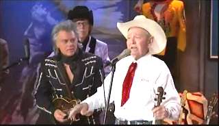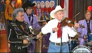 Marty said, "Opryland Hotel." Don said, "Opryland Hotel which I'd never been there before because I'm a Motel 6 kind of guy. And we got up there last night and he's got us the Presidential Suite up there and it's as big as this place. It's got two double beds in there. It's got two toilets. And I hardly ever use one toilet so I don't know what I'm gonna do with two toilets.And we got a big party room up there and it's just me and my wife in there so I wanna invite all you guys up for a big party tonight and Marty's gonna pay for all of it." Marty said, "One more piece of business. The Grand Ole Opry Square Dancers have come by to honor you and all the family today so Eddie Stubbs is gonna kick off 'Bile 'Em Cabbage Down'. If Apostle Paul will give you your fiddle back, you can jump in when you want to. How 'bout that." Don said, "That sounds great to me." Marty continued, "On behalf of The Maddox Brothers and Rose, how 'bout a hand for Eddie Stubbs and his flyin' fiddle and 'Bile 'Em Cabbage Down'. Come in Edwardo."