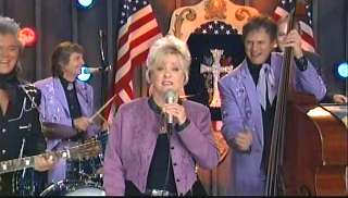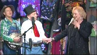 Don said, "Thank you, thank you, thank you, thank you." Marty said, "Mr. Don Juan Maddox right there." Eddie promoted Connie Smith's CD, Long Line Of Heartaches. After a commercial break, there was a montage of audio, video, and photographs of the Maddox Brothers and Rose. Marty said, "Welcome back, everybody. The Maddox Brothers and Rose, Superlatives. And over on the hay bale, how 'bout a hand for Miss Karen Wheeler, everybody. And, Superlatives? Hard to believe, Don Juan and his mule fiddle right there. Mr. Don Maddox, everybody. Turn around and show 'em your shirt, Don. America's most colorful hillbilly band." Don said, "You said 'The Superlatives'. What does superlative mean? I'm an old hillbilly and that's too big a word to me." Marty said, "It means we're dog gone good." Don said, "Thank you for explaining it." Marty said, "Speakin' of dog gone good, how 'bout a hand for Miss Connie Smith, everybody. Come here, baby. Look out. Hi Constance." Connie said, "How are you doin'?" Marty continued, "Did you hear Don tear up that fiddle song?" Connie said, "I heard him. That was great. We're proud to have you on this show." Don said, "I'm proud to be here." Marty said, "How 'bout a song from Sister Rose Maddox. Whataya think? Talk about it." Connie said, "I'd be honored. She was a great singer and it's kinda hard to follow her but I'm gonna do my best." Marty said, "What's it called?" Connie said, "It's called I'm goin' 'Down, Down, Down'." Marty said, "That's the one."