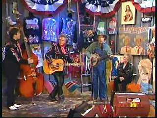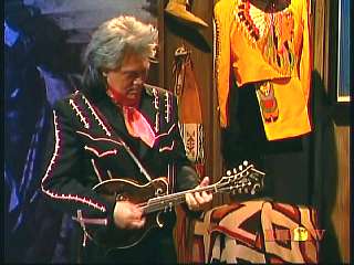 Eddie Stubbs said, "Mighty fine job there, Marty Stuart. 'Badlands'. That's the title track of one of his albums." Eddie then promoted Marty's photo book, Country Music: The Masters. After a commercial break, Marty said, "Thank you. Welcome back to The Marty Stuart Show." Hey, if you wanna talk to us by the way of the U.S. mail, write me at the Grand Ole Opry. Write Connie Smith at the Grand Ole Opry. The Fabulous Superlatives, Eddie Stubbs, Gary Carter, we'd all love to hear from you. And, Apostle, it's time, the time has come. We sang about South Dakota land. No tellin' what's on his mind. How 'bout a hand for the Sultan of Goodlettsville, the ole Tennessee Slicker, the most popular man in country music. Ladies and gentlemen, how 'bout a hand for Leroy Troy." Marty: "Hey. I got a greeting for you." Leroy: "What is it?." Marty: "I got a greeting for you from you all the folks in my hometown of Philadelphia, Mississippi at the Choctaw Indian reservation. You played down there last year and they just loved ya." Leroy: "Yeah, we had a ball, didn't we." Marty: "Looks like they scalped ya. All right " Marty removed Leroy's hat. "Whatcha got on your mind my favorite man of Goodlettsville?" Leroy: "Here's one called 'Nero Played His Fiddle While Rome Burned." Marty: "To the ground." Leroy: "All right." Marty: "An international event. Here it is."