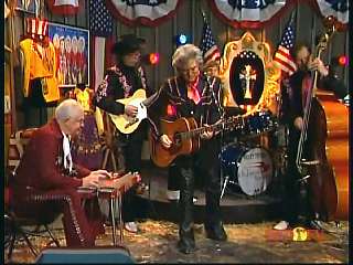 Eddie Stubbs said, "When songs are sung better, she'll be the one to sing 'em. That's Connie Smith right there and 'Walk Me To The Door'. A song she has on one of her albums." Eddie promoted the two DVD set of highlights from the first season of The Marty Stuart Show. After a commercial break, Marty said, "Welcome back, everybody. Wanna tell ya about a place called Pine Ridge, South Dakota. The Pine Ridge Indian reservation up in South Dakota land. I went there for the first time in the early 1980's and fell in love with the Lakota people. And never quit going back. We were there to play a benefit concert because I was told it was the poorest county in the United States of America. Well, maybe financially, but not spiritually. Those people showed up that night and they showed up in spades for me. I tell ya what. They were beautiful. Their wisdom, their dignity and their integrity. It showed the strengths of our original American people. Well, I got inspired a few years later to write a record called Badlands. The past, present and future of the Lakota people. That place is near and dear to my heart. Been adopted into the tribe since then. Connie and me got married up there. I just can't seem to quit goin' back. Here's a song -- the title of our record called 'Badlands'."