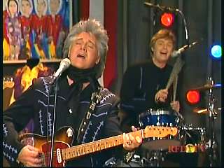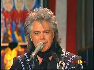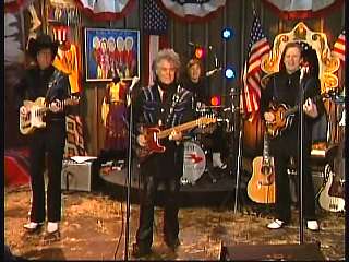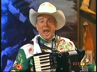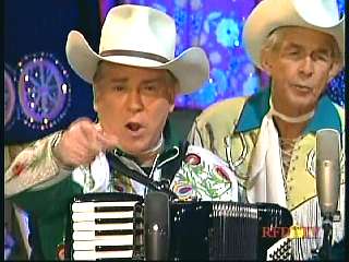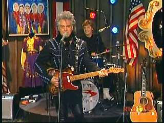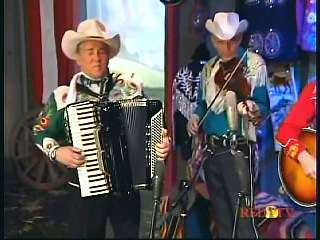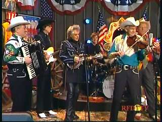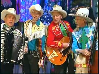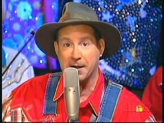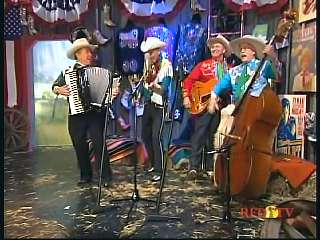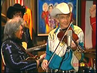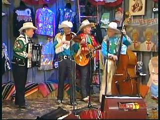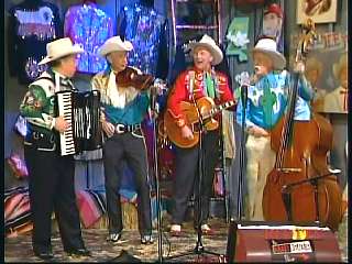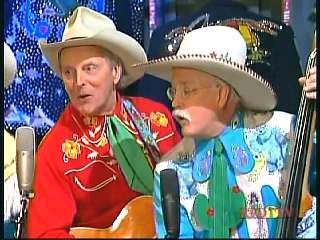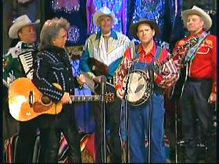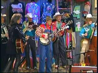 After a commercial break, Eddie Stubbs promoted the Superlatone Store. He introduced Marty. Marty said, "Truer words were never spoken from a man who's never seen a horse in person. Thank you, Tex. Ranger Doug, just in case there's any soul in America that don't know all the Riders In The Sky, would you please introduce the gentlemen?" Ranger Doug said, "I will take a moment. A man who has stood by my side for every one of the 32 years this band has been together, aging like fine cheese. That's Too Slim. Right here is the star of the upcoming motion picture Oh Brother, Where Am I?, that's Woody Paul, King of the Cowboy fiddlers. The Sultan of the stomach Steinway is Joey, the CowPolka King. And I remain Ranger Doug." Marty said, "The idol of American youth, the idol of American youth." Too Slim moves in next to Marty and says, "Marty, you're a great appreciator of fine instruments; you're a wonderful musician, we are presenting you with a Riders In The Sky guitar, ladies and gentlemen." Marty said, "Too Slim, I am honored, I am honored. Thank you, pal. Thank you, pal. It will go amongst the finest things." Too Slim said, "I know. Amongst the rest of the keepsakes that are available probably." Marty said, "That's beautiful. For your listening requirements. Hey, Ranger Doug. The last time we were here, Joey the CowPolka King and Cousin Kenny from the Fabulous Superlatives fame got together and played a polka." Ranger Doug said, "They had some fun." Marty continued, "Yes they did. But we left the great Woody Paul out. We should turn Woody Paul loose Whatcha got Woody Paul?" Woody Paul said, "Got the great 'East Tennessee Blues'." Marty said, "That's a big one. that's a big one. Make him feel welcome."