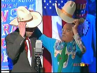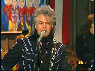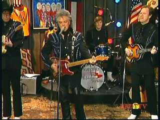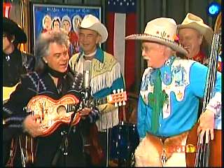 Marty said, "Yeah. Doesn't get any better than that. Hello Woody, Ranger, Too Slim." Eddie Stubbs said, " 'Press Along to the Big Corral'. Great sounds there from the Grammy-award winning Riders In The Sky. Thank you so much, fellas." Eddie promoted the two DVD set of highlights from the first season of The Marty Stuart Show. Too Slim joined Eddie making sounds while Eddie was reading the commercial, even exchanging cowboy hats with Eddie and mouthing the words of the commercial with Eddie. After finishing reading, Eddie said, " And we've got Too Slim visiting with us here right now and we have exchanged hats." Too Slim said, "I wondered if you knew I was here." Eddie said, "I did know you were here. And you know what? The Riders In The Sky had that hat made for me that you're wearing." Too Slim said, "How 'bout Eddie Stubbs' hat, ladies and gentlemen." Off camera, you could hear Marty say, "That's a fine hat." Eddie continued, "If I keep wearin' this, am I gonna go completely bald like you?" Too Slim said, "You go completely ... I rotated the crop here, Eddie, that's the great thing." Eddie said (taking off the hat), "Well, maybe I can borrow some of that for this here (showing his balding head)."