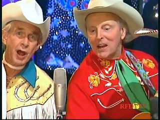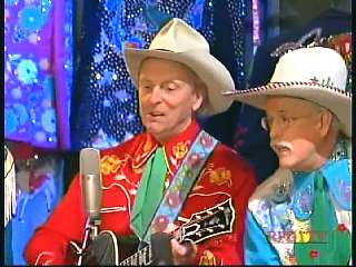 Marty said, "Happy trails to you, Leroy." Eddie said, "Great job there from Leroy Troy and 'The Happy Rovin' Cowboy'. Never heard Leroy do that. He sounds like he's ready to saddle up and head out on the trail. Well, we're gonna remove the hat right now because it's hymn time this week on the program, and we're gonna call on the Riders In The Sky to offer us our song of inspiration. Bob Nolan from the Sons of the Pioneers wrote this song years ago. 'Lord, You Made The Cowboy Happy'."