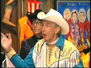 Eddie Stubbs said, "Marty Stuart right there singin' one of his own. 'A Hundred Years From Now'. Great job, fellas." Eddie then promoted Marty's photo book, Country Music: TheMasters. After a commercial break, Marty said, "Welcome back to The Marty Stuart Show, ladies and gentlemen. Hey, if you happen to notice, we've signs from our great state of Mississippi, my home state that I'm proud to be from, all around the set. If you're out drivin' around Mississippi, how 'bout going to Biloxi and see the beautiful lighthouse and the beaches. It's a sight to see. Speakin' of a sight to see, gentlemen. Here it comes. The Sultan of Goodlettsville, the most popular man in country music, Too Slim, the ole Tennessee Slicker. How 'bout a hand for Leroy Troy. Come here, Leroy. Hey Leroy, boy. Got your cowboy shirt on. There's the Riders In The Sky." Marty: "Look at you. Lookin' good with that cowboy shirt." Leroy: "Well, you know, I'm just tryin' to be a team player here." Marty: "Well, you've got it, you've got it." Leroy: "Doesn't make me look too slim, does it?" They all get the joke. Marty: "Whatcha got in mind to put all over America today and parts unknown?" Leroy: "Here it comes. 'The Happy Rovin' Cowboy'." Marty: "Well that's what it is."