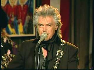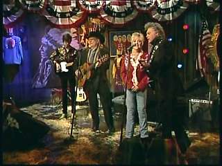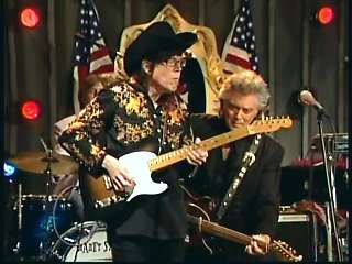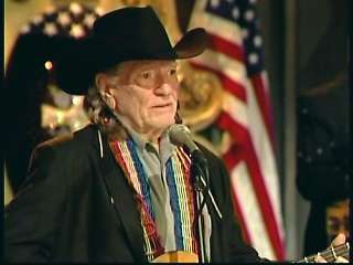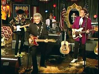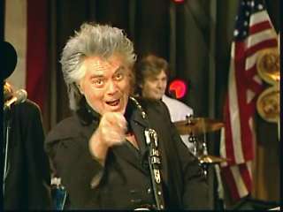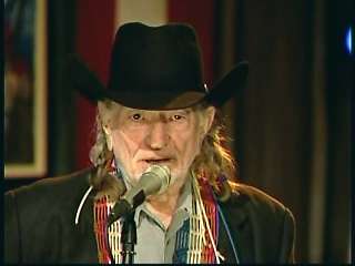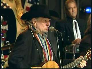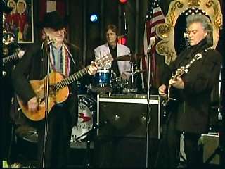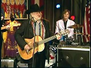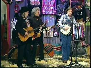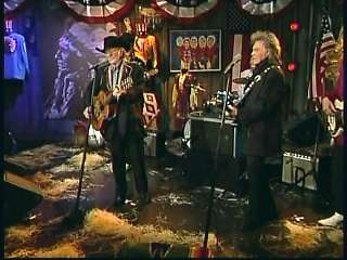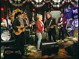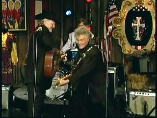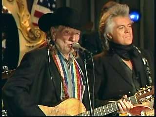 Eddie said, "Valuable advice and song there from Willie Nelson and Marty Stuart.together with 'Mama, Don't Let Your Babies Grow Up To Be Cowboys'. " Eddie promoted Marty's book of photographs, Country Music: The Masters. After a commercial break, in which RFD-TV congratulated Marty and Connie on their Grammy Nominations, Marty and Willie are on stage. Marty said, "All right, Willie." "All right," Marty and Willie said together. Marty continued, "Willie, I'm proud to tell ya that my home state of Mississippi is the sponsor of this show." Willie said, "All right." Marty continued, "And there's a town in east-central Mississippi that's near and dear to my heart and that's Meridian. I'm gonna tell ya all about in the weeks ahead. Meridian, Mississippi is Mississippi's royal city for country music. And the reason for that is it's the home of the Father of Country Music, Jimmie Rodgers." Willie said, "That's right." Marty continues, " You'll find the Jimmie Rodgers Museum there. It's a must-see. And if you like country music, I might suggest you atttend the Jimmie Rodgers Festival which has been happenin' each year the third weekend of May since 1953. And in Meridian, you'll find the Blues Trail Marker as well as a Country Music Trail Marker #1 honoring Jimmie at the Oak Grove cemetery where he now rests. While you're there, take him a flower. Speakin' of flowers, got one for ya." Willie said, "Whatcha got?" Marty said, "The Sultan of Goodlettsville, the ole Tennessee Slicker, the most popular man in country music. Gonna sing 'On The Road Again'. One of your big hits " Willie said, "All right." Marty says, "Here's Leroy Troy, Willie. How 'bout a hand for Leroy, everybody."
