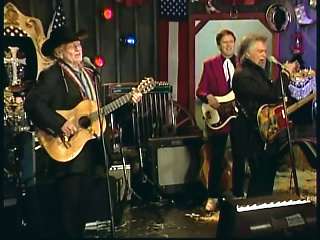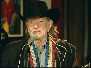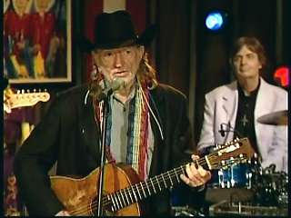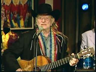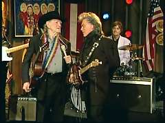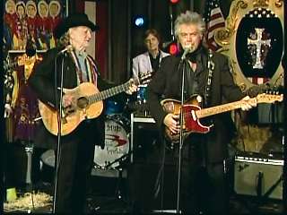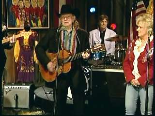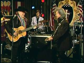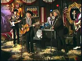 Marty said, "Welcome to the Marty Stuart Show. So glad to have ya. We got country music. Big time country music on our mind today. Stick around with us for the next half hour. We'll do all we can to entertain ya. Superlatives?" The Superlatives said, "Yeah?" Marty continued, "Gonna be big." Someone said, "It is." Marty goes on, "We got a dear friend here. A man I love and admire so much. Talk about an American original. He personafies it all. How 'bout a hand for my friend and yours, the great Willie Nelson. Come here, Willie." Willie walks on stage. Marty says, "Well all right." Willie says, "Good Hearted Woman." Marty said, "Good Hearted Woman." Willie said, "Let's do 'Good Hearted Woman'." Marty said, "Ya'll know that one, right." Willie said, "Let's do this for Waylon, you want to?"
