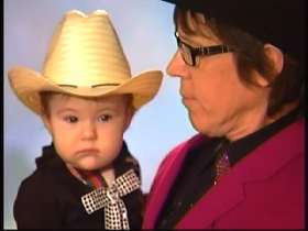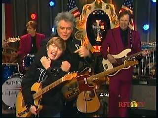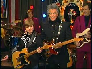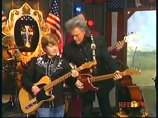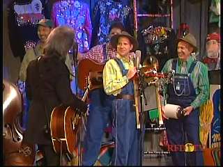 After a commercial break, Eddie Stubbs promoted the Superlatone Store. He introduced Marty. Marty said, "Look what I found, Eddie Stubbs. I found a guitar star, Superlatives. Eleven-year-old March Martin. Ya know where we found him? At the Apostle Paul's house. Him and Jamie got a house full of pretty kids that play music. March, welcome. Glad you're here." March said, "I am, too." Marty continued, "Well, I hear you're pretty bad on our theme song, 'La Tingo Tango'. I hear you can play a pretty bad version of it. Would you tear it up for us?" March said, "Sure." Marty said, "All right."