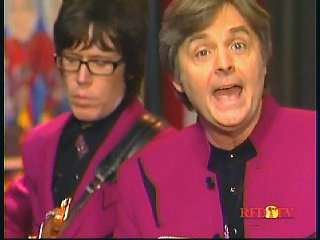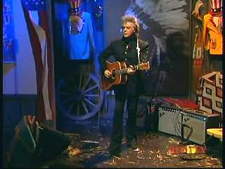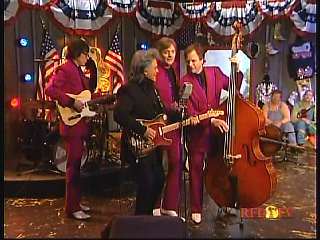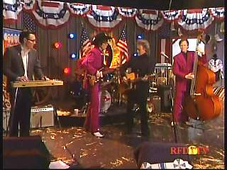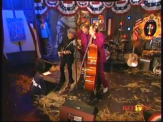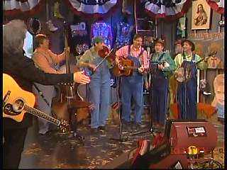 Marty said, "Well, now that's the way to do it right there. That's the way to do it. Fine job, Jug Band and Leroy." Eddie said, "Aw, The Tennessee Mafia Jug Band. They are so great. 'Charmin' Betsy'. We tried to get the fellas to bring Betsy along this trip but they wouldn't let her out for work release. There's always next time, I guess. Well, it's hymn time this week. The Fabulous Superlatives Quartet are gonna render this song for you right now. It's one that Marty Stuart and Handsome Harry Stinson wrote .... 'There's A Rainbow At The End Of Every Storm'."