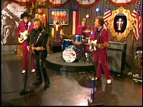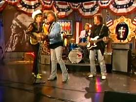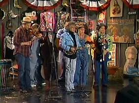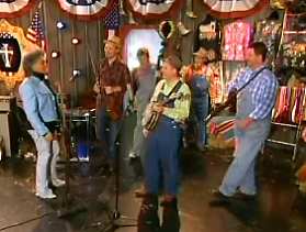 Marty welcomed everyone to the show. "Welcome to The Marty Stuart Show. If you're looking for country music like I said last week, you've come to the right place. Do you like country music? Huh? All right. That's all right with me. Hey Superlatives. I noticed when we got here the green pulpwood truck with the bass fiddle tied on top could only mean one thing. The Tennessee Mafia Jug Band is in town. How about a hand for the Tennessee Mafia Jug Band. Hello Leroy, Mike, Ferg, Matt Combs and there's Lester. Welcome to town boys. What's going on from the good word in Goodlettsville?" Leroy: "Well we got Lester and Mikey and Fergie and Matthew. We're all right here." Marty: "Well play us a pretty one. How about a hand for the Jug Band, ladies and gentlemen." Leroy: "This is for Mikey," They performed the song "Tied Down." Marty and His Fabulous Superlatives were side stage watching, clapping and Marty was dancing.