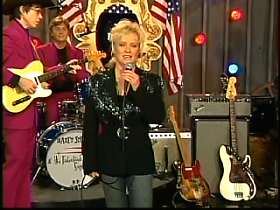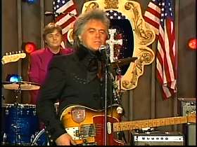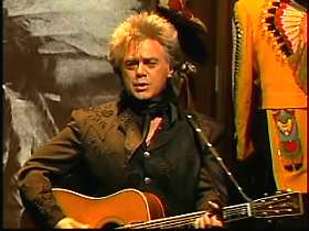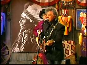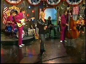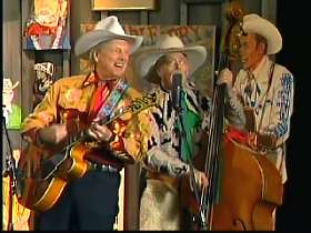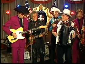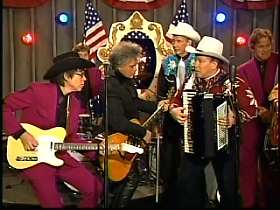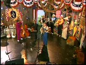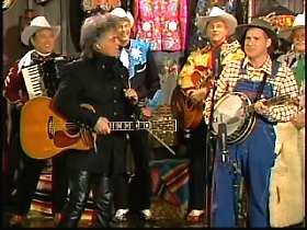 After a commercial break, Eddie Stubbs promoted Connie's CD Clinging To A Saving Hand. Marty said to Eddie, "Get your cowboy hat back on and join us. If you've enjoyed watching our show today and if you've enjoyed Eddie Stubbs hat, write me at the Grand Ole Opry. We'd be glad to hear from you. Superlatives, how about a hand for the Riders in the Sky, some of our big musical heroes. Ranger Doug, Woody Paul, Joey, Too Slim. It's an honor to have you guys. Cousin Kenny, Joey, the cow polka king, you know what to do. Here it is, 'Buck's Polka'."
