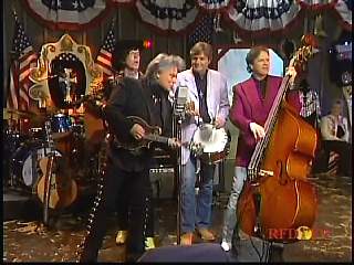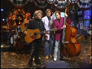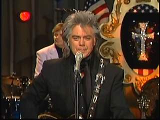 Marty said, "So lucky, so lucky." Eddie Stubbs walked over to the microphone. Marty continued, "There's a lucky man right there. Lucky man." Eddie said, "That's the luckiest man I know, right there. He's got 18 belt loops on each pants' leg." Marty joked, "I can get out of 'em fast."Eddie said, "I bet you can." Eddie promoted Marty's photo book, Country Music: The Masters. After a commercial break, Marty said, "Thank you very much. Hey, if you would, write me at the Grand Ole Opry. Wanna know what you're thinkin'. Thank you for watching our show. And, Apostle, we're gonna send this show to the capital city of Mississippi, Jackson. And might even be a few people in Stallo, Mississippi watchin' us and Noxapater, too. You're welcome, too. But now, it's time. Emmylou, it's time........ for the Sultan of Goodlettsville, the most popular man in country music. Connie, here he is, the ole Tennessee Slicker, Leroy Troy. Make him feel welcome, ladies and gentlemen. Hey, look-a-there. Look-a-there (pointing to Connie and Emmylou who are sitting on the hay bales). Two of 'em. Nice ones." Leroy said, "Yeah." Marty continued, "Hello Leroy." Leroy said, "Hey, let's do 'Mountain Dew'." Marty said, Come on."