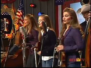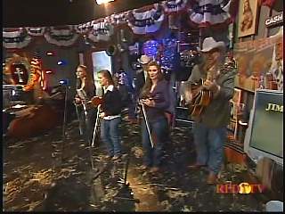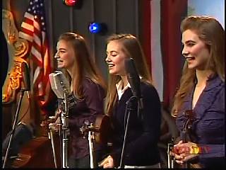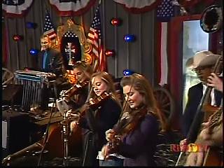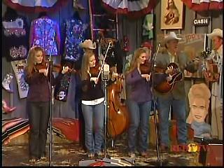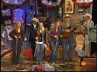 After a commercial break, Eddie Stubbs promoted the Superlatone Store. He introduced Marty. Marty said, "Why thank you, Mr. Stubbs. A fine job. I know why you're hangin' around over here. This is your favorite band right here." Eddie said, "I love these people." Marty continued, "I do, too. They're my favorites and Connie's favorites. They're all of our favorites and I appreciate the music you're makin' right now. Can we have one more song out of ya? Ladies and gentlemen, The Quebe Sisters Band. Come on, Eddie." The Quebe Sisters sang "How High The Moon."