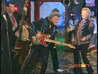 Leroy: "Hey, I've got Miss Karen Wheeler." Marty: "Miss Wheeler." Karen: "And he's mine." Marty: "Well, that's all right. You can keep him. You know one of the things I love the most about your city of Goodlettsville, Tennessee?" Leroy: "What?" Marty: "Roy Acuff and the Smoky Mountain Boys are still big news there." Leroy: "They sure are. And I'll tell ya what, Marty. When I was a little boy ,,,," Marty: "Yeah." Leroy: "I used to love listenin' to the Grand Ole Opry on Saturday night. Could hardly wait for Mr. Acuff's show to come on. And Onie Wheeler would blow that train whistle and play that harmonica, and this is Onie's little girl." Marty: "Karen, that's right." Leroy: "And .. I've got my ole buddy Superman. We're gonna have Darrin, Jamie and Connie join in. We're gonna do 'Night Train To Memphis'." Marty: "Well, kick it off there boy." Leroy: "All right."