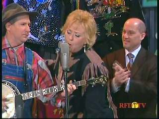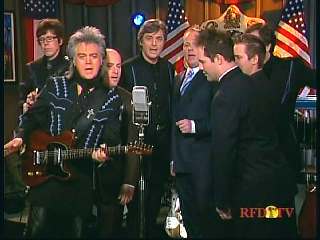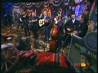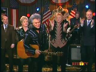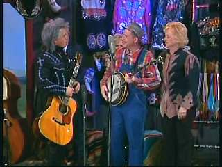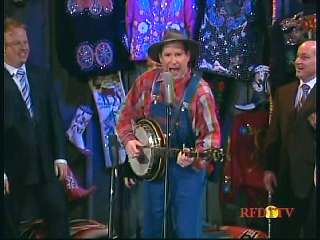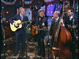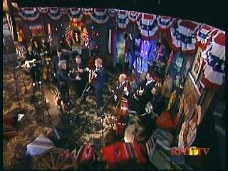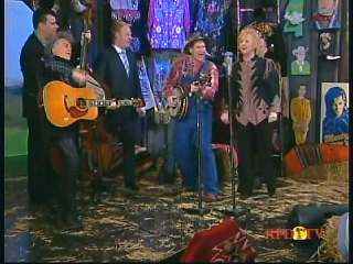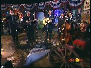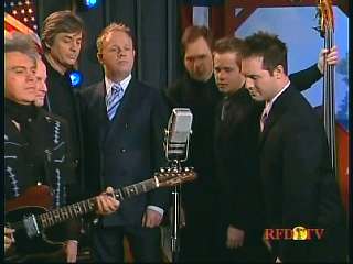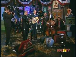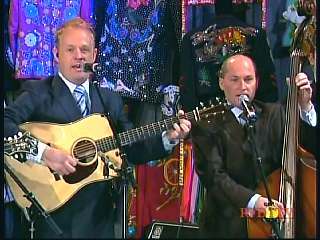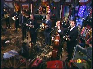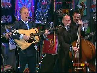 Marty said, "Hey. 'The Night Train To Memphis'. Fine job on the train song." Eddie Stubbs said, "Great old time music right there from Leroy Troy and Karen Wheeler and all the gang and 'Night Train To Memphis'. Well you know they were shoutin' Hallelueh and that got me to thinkin' that it's gonna be Sunday before we know it and we'd like to encourage you and yours to attend the church of your choice and with that theme in mind, we'd like to declare hymn time this week. We've got Dailey & Vincent and the whole group and, of course, Marty Stuart and The Fabulous Superlatives gathered around the mike to do one of one of the old Bill Monroe favorites .... "Get Down On Your Knees and Pray'."