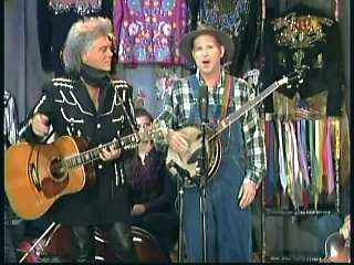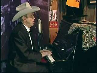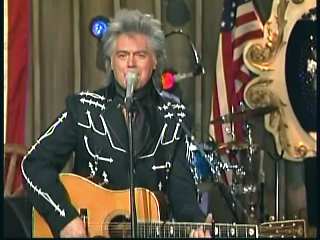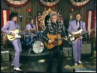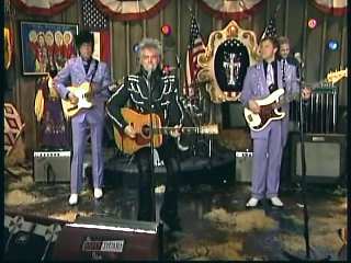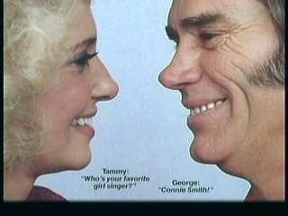 Eddie promoted Marty's book of photographs, Country Music: The Masters. After a commercial break, Marty and George Jones were on stage. Marty said, "Welcome back, everybody. Welcome back, Mr. Jones." George said, "Thank you, Marty." Marty continued, "All right. As always, I'm proud to tell ya that this show is sponsored by my friends in Mississippi. Now, about 80 miles up the road from the historical old capital building, Mississippi's capital of Jackson, is the Queen city of Meridian. Meridian is regarded as and important railroad town. To celebrate that, Meridian's own Railroad Museum and the Mississippi Heritage Museum join together annually on the first weekend in November for a festival known as Whistle Stop Weekend. It's a free event, filled with fun and good community fellowship. George, listen close and you might even hear Jimmie Rodgers sing a song." George said, "I tell ya what. I'd love to hear that." Marty said, "Me, too, buddy. How 'bout a hand for everybody in Meridian, ladies and gentlemen. Famous, famous, famous." Marty holds up an old issue of Country Music magazine and says, "Look here. Look here at what I got." George said, "Where in the world did you find that?" Marty said, "The Country Music Hall of Fame sent this over there. And Tammy says to George...." George says, "How do ya like them sideburns?" Marty said, "That's nice. Them is pork chops." George and Marty laugh. Marty said, "Tammy said, 'Who's your favorite girl singer?' and George said ...." George said, "Connie Smith." Marty said, "There ya go." George said, "Went over real big then." Marty and George laughed. Marty said, "Well, here's how it works at my house. You're her favorite singer but Tammy Wynette's my favorite girl singer, too." George said, "Well, it's all in the family." Marty said, "It's all in the family. Naw, it really is Connie. I tell ya what. Speakin' of famous though and all in the family, here he comes. You're gonna love this. It's the old Sultan of Goodlettsville, the Tennessee Slicker, George. Leroy Troy. How 'bout a hand for Leroy, everybody. What about it. Hello, Leroy. You know George." Leroy said, "Hey, George." Marty said, "The Quebes .... Whatcha got on your mind?"