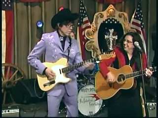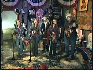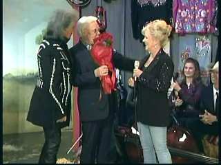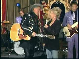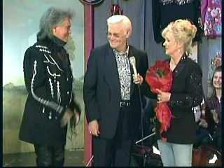 Marty said, "That's the Quebe Sisters Band right there.That's the way to do that. Attaboy Joey, too. Ladies. After a commercial break, Marty and Connie were on stage. Marty said, "Welcome back and we still love Connie Smith. We love The Quebe Sisters Band." Connie said, "I love The Quebe Sisters Band." Marty said, "How 'bout a hand for The Quebe Sisters Band. Constance, who's your favorite male country singer of all time?" Connie said, "Everybody knows it's George Jones." Marty said, "George Jones is here to say 'hi' to you. How 'bout a hand for the greatest country singer of all time, George Jones. Come here, George." George came onstage carrying a bouquet of red roses for Connie. George said, "Marty, how ya doin'?" Marty said, "All right, George." Connie said, "Hi George." George said, "My favorite singer." Connie said, "Oh, bless your heart." George said, "Some beautiful flowers for a wonderful, beautiful lady." Connie said, "Thank you, George." George said, "And I mean that." Connie said, "Aw, you being here is special." Marty said, "Hi, Possum. Oh we can't thank ya enough for comin' by. I have to listen to a lot of George Jones music at my house and that's all right with me." George said, "Well, I appreciate that." Marty said, "Yes, sir." George said, "And the next time I'm on your show, I'm gonna try to sing a song." Marty said, "That will be fine." Connie said, "I can't wait." Marty said, "Tell ya in the mean time, you just get over there and relax and we'll sing a couple for you." George said, "I'm gonna listen real big then."