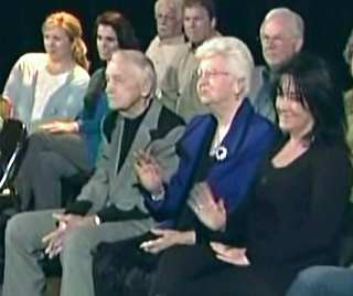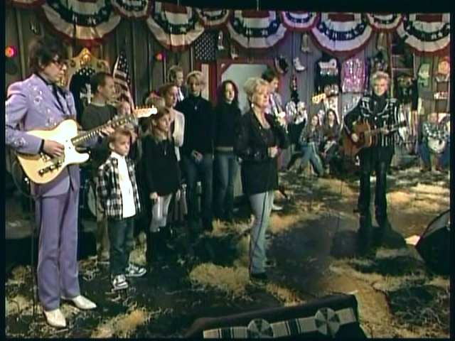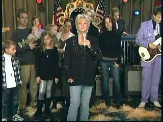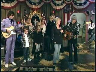 Marty said, "Yes, sir, Leroy. That oughta get her done right there." Marty and Connie are on stage. Marty says, "Leroy's family. And I know that family's important to you. It is the ultimate thing to you." Connie sayd, "Yes." Marty continued, "I've often said that if Connie was going to get the greatest award in the world and one of the kids called, the award would have to wait and that's the way it is. Concernin' family, your momma-in-law, your daddy-in-law, and your sister-in-law, John, Hilda and Jennifer are out there. Give 'em a nice hand for comin'." Connie said, "I love you." Marty said, "Connie has a son in Taiwan, Kerry. Darren is in Norway with three grandbabies so they couldn't be here, but some of your other babies got to come today. How 'bout a hand for Connie's Jeanne, Jodi and Julie and all the grandbabies. There they come. Aw, yeah. Jonas and Jordan, Dylan, Zander. Gather around your mama here, children. Hi Jonas." Connie sang, "You'll See Jesus."