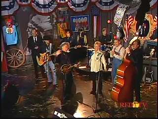 Eddie promoted Connie's boxed set Born To Sing. After a commercial break, Marty said, "Well, that's the kind of stuff I'm talking about, Apostle." Marty shakes Paul Martin's hand." "Looking good Apostle. Ladies and gentlemen, here he is. You've asked for him. The Sultan of Goodlettsville, the most popular man in country music -- John Rich, you might ought to get to attention for this -- the ole Tennessee Slicker Leroy Troy. How 'bout a hand for Leroy. Welcome Leroy. You know John, Connie, Gary. I don't know what you're up to today, but you even brought the preacher with you." Leroy: "Hey, I did. I brought Brother Gene with me." Marty: "Well that's good." Leroy: "I figured if I can't make it to church every Sunday morning, at least I can have Brother Gene out to see me." Marty: "That's good. We're glad to have Brother Gene. Sing him a song." Leroy: "All right. Let's do 'Miss Molly'."