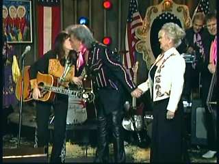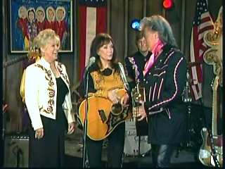 After a commercial break, Eddie Stubbs promoted Compadires: An Anthology Of Duets at the Superlatone Store. Eddie said, "Once again, here's Marty Stuart." Marty said, "Thank you, Eddie Stubbs. How 'bout a hand for Eddie Stubbs, everybody. Didn't he do a fine job." Connie said, "Ain't he pretty." Marty continued, "Hey, Connie Smith." Connie said, "Yes." Marty said, "Who's your favorite girl singer of all time?" Connie said, "Well, everybody knows it's Loretta Lynn." Marty said, "How 'bout that. I love that. Come here. I wanna tell you somethin'." Loretta said, "Okay." Marty said, "Last week, George Jones was on the show and she said that George Jones was her favorite singer of all time. If she don't straighten up ..." Connie interjected, "Male singer." Marty continued, "Can I come to your house?" Loretta said, "Yeah, honey." Marty said, "All right. That's the way it is right there. Ya'll heard it right here." Loretta laughed and said, "Oh me." Marty said, "I love every song you've ever done and that's the truth. I love every Loretta Lynn song. But there's one in particular that touches my heart mighty deep. Would you please do 'Blue Kentucky Girl' for us." Loretta said, "That's one of my favorite, too." Marty said, "All right. We'll have ole Mark Casstevens take it off here. Markus......"