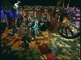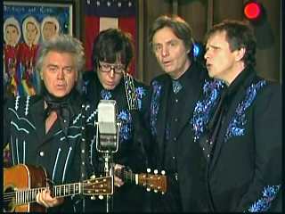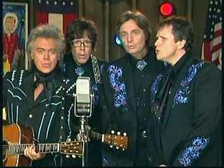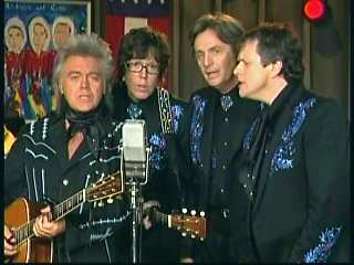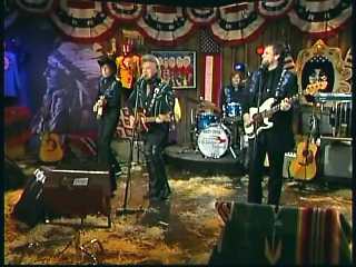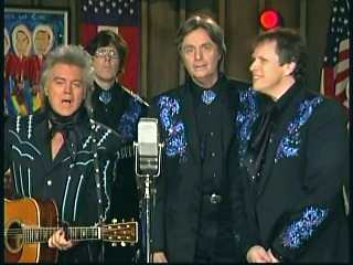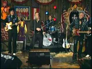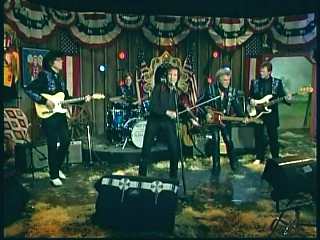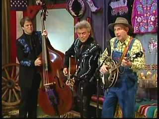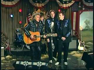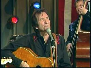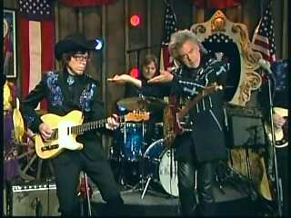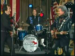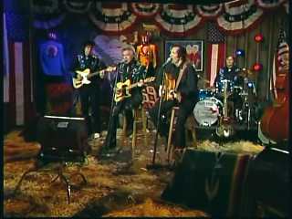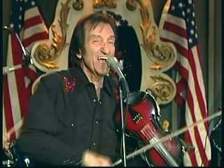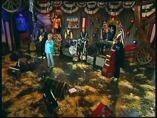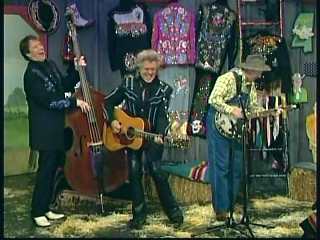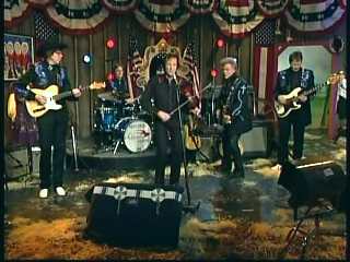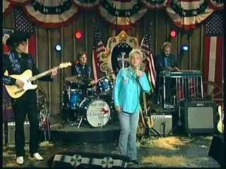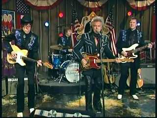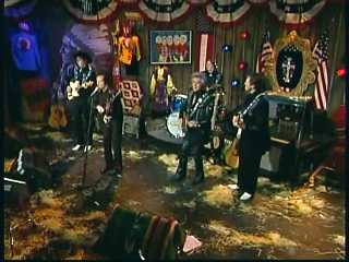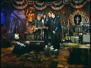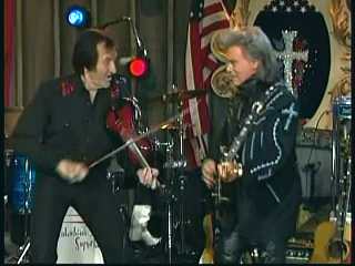 Doug Kershaw said, "Blue Town." Eddie promoted Marty's book of photographs, Country Music: The Masters. After a commercial break, Marty said, "Well, all right. Let's talk about our sponsor, Apostle. What do ya think? Well, I'm speakin' of the great state of Mississippi. They sponsor The Marty Stuart Show. And Mississippi is called the birthplace of America's music. The honorable home of much roots music royalty. Over the next couple of weeks, I'm gonna be tellin' ya about important destinations in central Mississippi on the Blues and Country Music Trails. Tonight, it's Meridian, which is a royal music city. It was the home of one of America's musical forefathers, Jimmie Rodgers, who is honored with a Blues Trail Marker as well as Country Music Trail Marker #1. Jimmie's songwritin' pal, Miss Elsie McWilliams has a trail marker in her honor at the courthouse. And in the near future, the granddaddy of all the American music festivals. the Jimmie Rodgers Festival, which was established back in 1953 will receive a marker all its own. Two more Blues Trail Markers honoring a host of Mississippi's blues and jazz musicians will soon be unveiled, makin' Meridian, Mississippi the most awarded city on the Blues and Country Music Trail. Marker. A great honor indeed. How 'bout a hand for our friends in Meridian. Apostle....." Paul said, "Yes." Marty continued, "Doug, Connie. Speakin' of honors. It is indeed an honor to introduce the Sultan of Goodlettsville, the ole Tennessee Slicker, the most popular man in country music, how 'bout a hand for Leroy Troy, everybody. Come here, Leroy. Hey, Hey." Leroy sang a parody of "Ghost Riders In The Sky" called "Ghost Chickens In The Sky." Marty cracked up hysterically each time Leroy did his rooster crow.