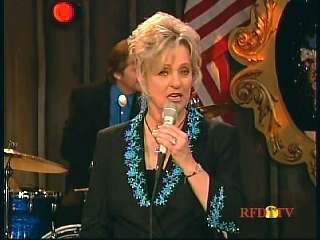 Marty said, "Fine job, Handsome. Still married." Eddie Stubbs said, " 'Sailing Around The Moon (With Pretty Little Constance June)'. I wonder if the folks at NASA know that Connie's been implemented into the space program. We'll have to make sure they get a record of that there. Leroy's got that on a great record too as a matter of fact. Well, it's time to get serious with ya right now and we'd like to declare hymn time this week. And we're gonna get all the cast to join in behind Connie Smith as she sings one of her favorite tunes that was written and put out years ago by Miss Martha Carson. It's called 'Satisfied'."
