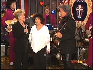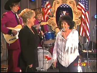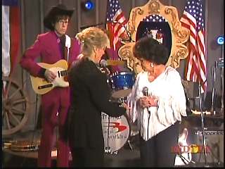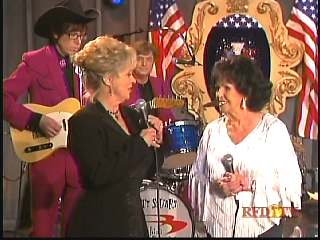 Marty brought Wanda Jackson back on stage and said, "Baby, here's Miss Wanda Jackson, in person." Connie said, "I'm so honored just to be in your presence." Wanda said, "It was worth my trip to hear you sing." Connie said, "Oh bless your heart." Marty said, "I wanna hear the two of you sing a song together. Never been done, right?" Wanda said, "Never done" and Connie said, "No." Marty said, "Well, can we take care of it?" Wanda said, "Why not. "Silver Threads And Golden Needles'." Marty said, "My favorite, my favorite. Come on." Wanda said, "We're gonna do all the verses."