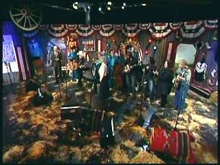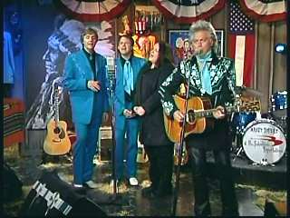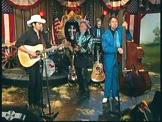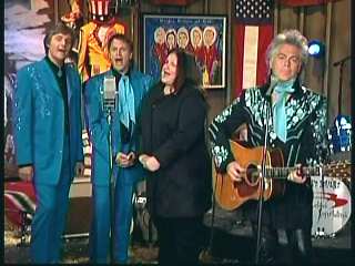 Marty said, "Almost nailed it." Eddie Stubbs said, "Leroy Troy right there and 'Country Music's Gone To Town'. Well, whether you're from out in the country or from the city, the songs of inspiration are some of the most requested that we do here on this show. Marty Stuart wrote a brand new one. As a matter of fact, it makes its debut on this particular performance. And he had in mind Lorrie Bennett, the daughter of Anita Carter and the granddaughter of Mother Maybelle Carter, to sing the high harmony on this. She's gonna join Handsome Harry and the Apostle Paul. Marty's gonna lead this one. 'His Love Will Lead Us On'."