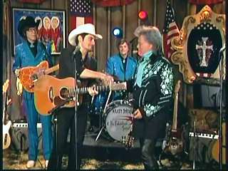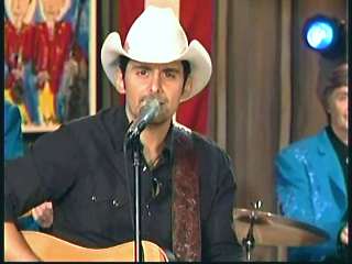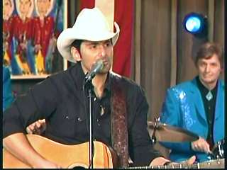 After a commercial break, Eddie Stubbs promoted the Marty Stuart Tribute Revolver. Eddie said, "And once again, here is Marty Stuart." Marty said, "Thank you, Eddie Stubbs. How 'bout a hand for Eddie Stubbs. What do ya think about him, Brad?" Brad said, "I think he's the best in the world." Marty said, "Me too. And I think you're great." Brad said, "You too." Marty continued, "You're makin' a lot of people happy out there right now." Brad said, "Well, I hope so." Marty said, "You are." Brad said, "That's the goal." Marty said, "And I tell ya what. You're doin' a great job for country music. Thank you very much." Brad said, "Thanks for sayin' that. So are you." Marty said, "And look-a-here. You got 'em out of jail just to bring 'em." Brad said, "I know. Look at those guys." Marty said, "Kendal and Justin." Brad said, "And thank you for puttin' this show on the air. What a great thing." Marty said, "Well, thank you for comin' by to do it. That's what keeps it goin'. Sing a big hit, would ya?" Brad said, "I'll try." Marty said, "Whatcha got? Mr. Brad Paisley, ladies and gentlemen." Brad sang "Anything Like Me."