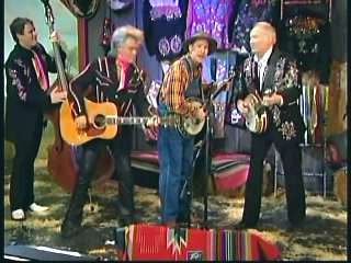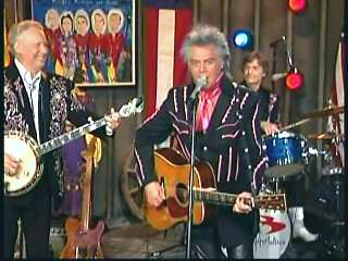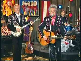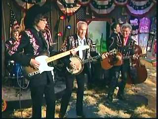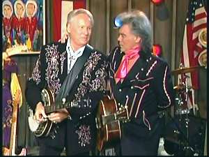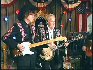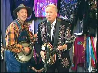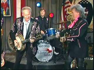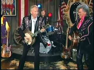 Marty said, "How 'bout a hand for ole Buck Trent. Come here, Buck. Glad you're here." Buck said, "Oh yeah. Ole Buck Trent." Marty said, "Ole Buck Trent." Buck said, "Ole Buck Trent." Marty said, "The reason I say that is ole Buck Trent's been in my life for a long time and I love Buck Trent. I love you." Buck said, "Oh thanks. I love you, too." Marty continued, "Watchin' you on TV growin' up in Mississippi on The Porter Wagoner Show, all of you .... the entire cast. It was great." Buck said, "You was a kid really." Marty said, "You were, too." Buck said, "I've got shoes older than you." Marty and Buck laughed. Buck said, "I went with Porter from '62 to '74." Marty said, "Well, ya'll made a lot of great records. And there's one song in particular that when it would come along, Porter and Dolly would do it." Buck said, "That's right. It was a big hit for 'em." Marty said, "Yes it was. And you made it a big hit with that banjo." Buck said, "Whoa." Marty said, "How 'bout we do this one right here.Superlatives ....." Marty and Buck performed "Holding On To Nothing."
