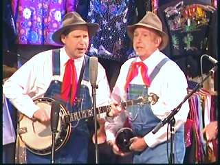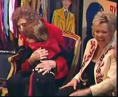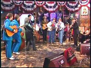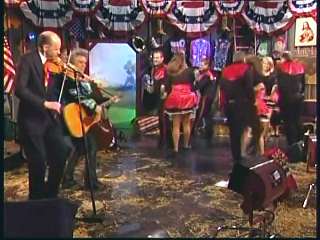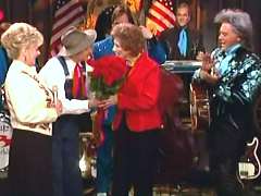 Marty said, "Stop the world ....." Marty hands his guitar to Paul. " Here ya go Apostle." "This is a special edition of our show today. We are here to pay honor and give a command performance to bring all our country hearts to our Queen of Country Music. How 'bout a hand for Miss Kitty Wells, ladies and gentlemen." Kitty waves to the audience. Marty continues, "We love you. You betcha. Eddie Stubbs, need to talk to ya. How 'bout a hand for Mr. Stubbs, ladies and gentlemen. Lookin' good today, sir." Eddie said, "Thank you, sir." Marty said, "Hey, we owe a big 'thank you' to Johnny Wright and Kitty Wells for bringin' you to town." Eddie said, "They did indeed back in 1995." Marty said, "Well, thank ya'll very much for givin' us Eddie Stubbs. Yeah. I heard you play a fiddle tune on their show one time called 'Bile Them Cabbage Down'". Eddie said, "And Johnny used to sing it." Marty said, "He could do it, he could do it. And I tell ya what. When Eddie Stubbs starts to fiddle, the Grand Ole Opry Square Dancers, the great Grand Ole Opry Square Dancers gonna come chargin' through that door and salute Miss Kitty Wells. Cousin, Handsome, Apostle, Edwardo, kick off the fiddle tune."