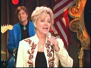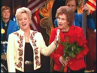 Marty said, "Fine job Mr. Stubbs. Grand Ole Opry Squaredancers. Whooo" Eddie promoted the two DVD set of highlights from the first season of The Marty Stuart Show. After a commercial break, Marty said, "Welcome back, ladies and gentlemen, to The Marty Stuart Show. Superlatives. Wish you'd look. The Queen of Country Music, Miss Kitty Wells, is right there. All the Grand Ole Opry Square Dancers. And on the front row, Miss Sue Sturdivant and Stephanie, Miss Kitty Wells' daughter and granddaughter. Connie's son Kerry came all the way Taiwan and my sister Jennifer came all the way from Smyrna. How 'bout a hand for family. Speakin' of family, Mr. Kitty Wells and Mr. Johnny Wright just celebrated 72 years of marriage not long ago. Yeah, congratulations. That's about 140 in show biz years. Here comes a lady that I guarantee ya loves Miss Kitty Wells. How 'bout a hand for another great one. Miss Connie Smith, everybody. Come here, Constance. Here she comes. Making believe." Connie performed "Making Believe."