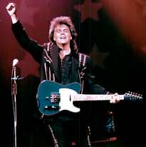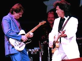 "Tempted" was next and Marty played the new signature Telecaster guitar. They are back to using the strobe light during the bridge of the song. Cool effect, but how do Marty and the band keep from getting dizzy? Marty talked about the "Singles" ads in the paper and performed the John Prine song "We Are The Lonely." During this song, each of the band members is spotlighted with solos, starting with Gregg, then Steve, Brad and (finally) Gary. Marty picked up the mandolin and began playing. It's the highlight of any show! He's chosen the song "Dark As A Dungeon" which he has turned into a beautiful, emotionally-filled song. Just to watch Marty push the mandolin to his side and emote these feelings with his hands and arms, is breathtaking.