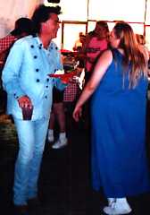 Marty walked among the fans while we were eating. He gave out hugs, kisses, handshakes and minutes of his time. Being the down-to-earth person he is, he even walked over and helped himself to some iced tea and dessert! He stopped to talk with the fans along the way--that's just how Marty is. After folks were done eating, some fans found a place on the floor in front of the stage, anticipating Marty making his appearance. I'm sure you can recognize some faces in these photos: Tami from Panama City, FL; Lisa Phillips from Tuskaloosa, AL; Penny Risk from Seattle, WA,; Barbara Smith from Maryland; Chad Decker brought little Anna back. Chad and Summer moved to Oklahoma this year and they promised Anna they'd bring her back for Marty's party. Grandma Margie is also in the picture as well as Margie Brodmerkle from Oakham, MA; Corinne Greaves from Connecticut; Cindy Allred from Dora, AL; Mary Runyan from Dayton, TN; Jill Meister from Greenville, KY; Evelyn Totty from Mayfield, KY; and I can see Pat McLaughlin just behind Evelyn's waving hand (Pat's wearing a hat). As you can see, people came from miles and miles around to enjoy the party.