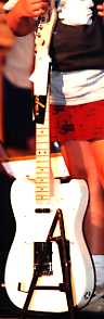 Last up for bid was a white Fender Telecaster guitar. Someone asked if the guitar was made in the USA or Mexico. Jodee had no idea, so she looked on the guitar and found out it said Mexico. The bidding opened at $500. Two fan club members went back and forth with the bidding, which ended at $2,400. And, no, Jodee's daughter Rachel did not come with the guitar! She does look cute in those Marty boxer shorts, however.