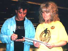 Marty had finally arrived (we could tell due to the screams of the crowd) and the line started to move. We finally decided to get up and stand....... and wait. Maria-Elena was there to take pictures. Some fans had a lot of things they wanted signed, but line moved fairly fast. It seems like you're up there and gone in a flash. Kristin, here's Marty signing your CD cover. We were toward the end of the line, so we just waited until Marty was finished signing and posing. He had to "ham" it up with Connie for some pictures. Those "bunny ears" went up and down on the back of their heads. Then, all too soon, it's over and, out the door we went.