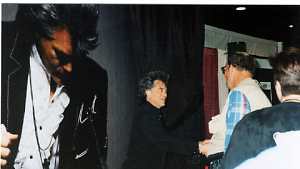 | The backdrop to Marty's booth | Marty shakes a lot of hands |